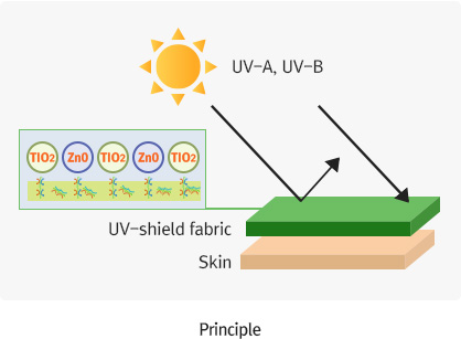 「UV-shield」 is a finishing technology using cosmetic ingredients which gives superior ultraviolet blocking and