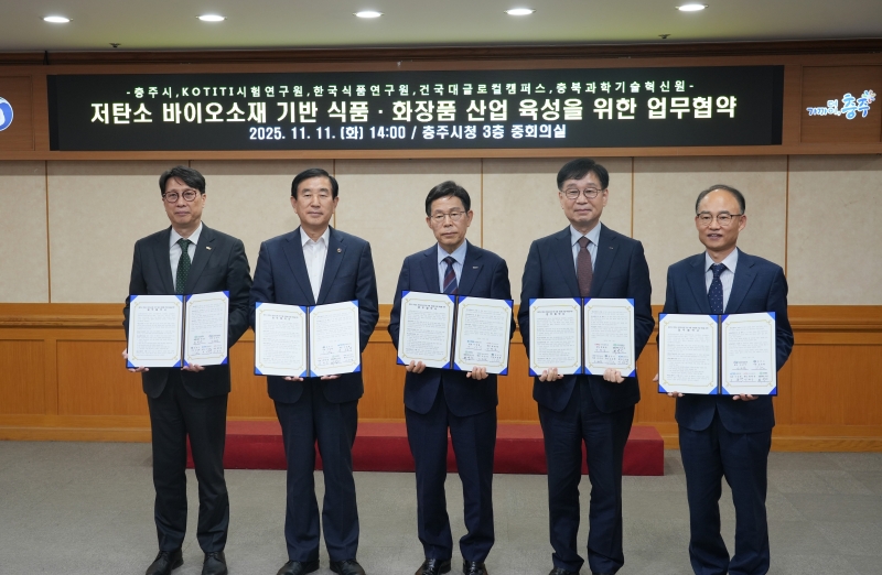 우리 연구원은 지난 11일 충주시, 한국식품연구원, 건국대 글로컬캠퍼스, 충북과학기술혁신원과 함께 저탄소 바이오소재 기반 식품·화장품 산업 육성을 위한 다자간 업무협약을 체결하였습니다.