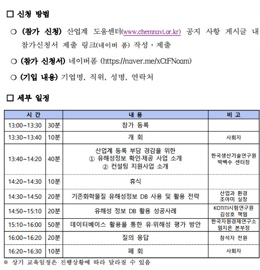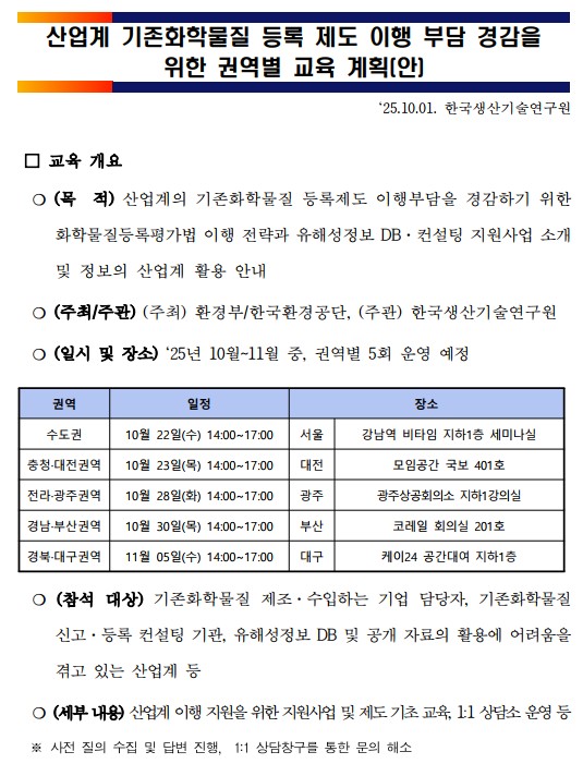 산업계 기존화학물질 등록 제도 이행 부담 경감을 위한 권역별 교육 개최 안내