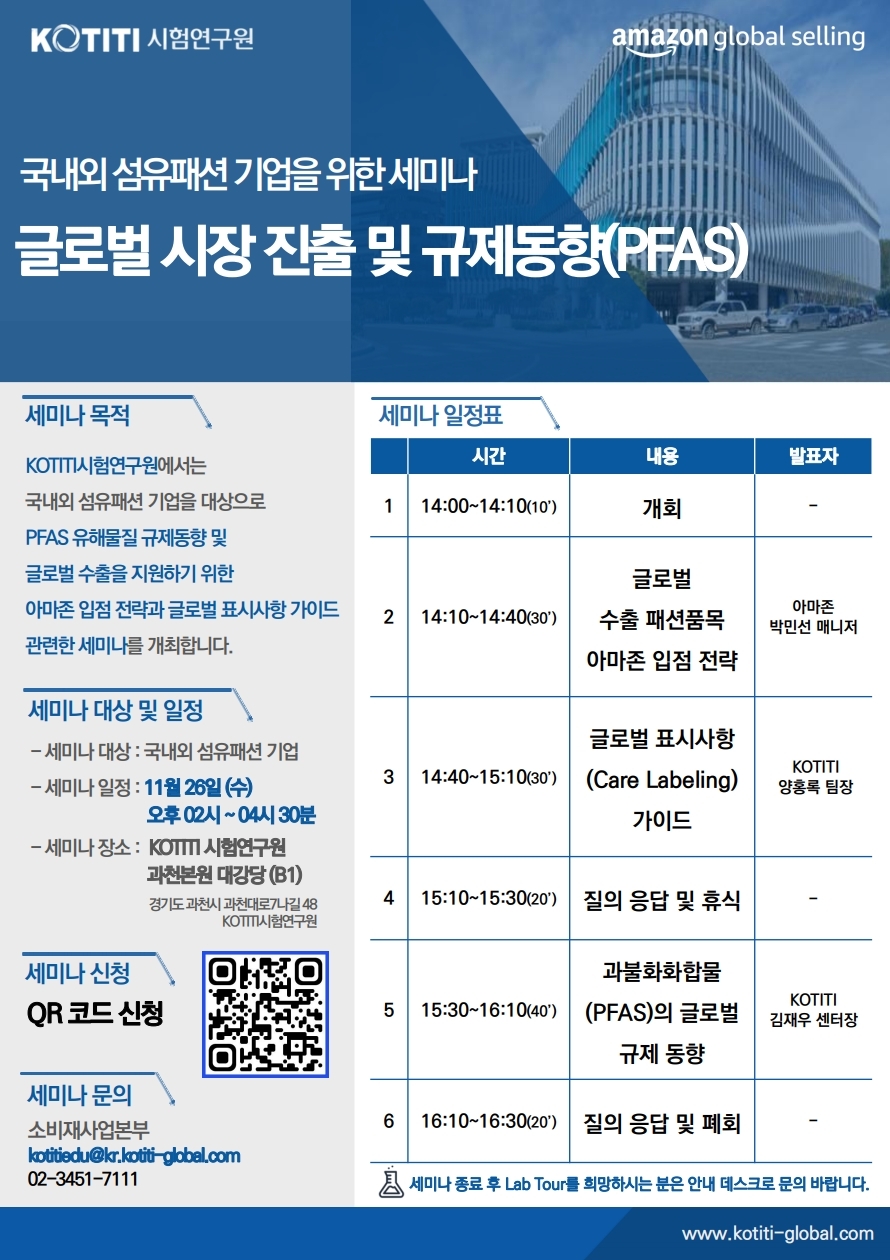 글로벌 시장 진출 및 규제동향(PFAS) 세미나 개최 1. 행 사 명 : 글로벌 시장 진출 및 규제동향(PFAS) 세미나 2. 일시/장소 : 2025.11.26(수) 14:00~16:30 / KOTITI 시험연구원 과천본원 대강당(B1) 3. 신청 URL : https://forms.gle/aZ9G2AUDkg1yhQnK7