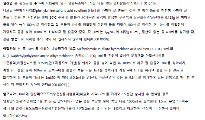안녕하세요. 정제수 시험 관련 문의사항이 있습니다. 당사에서 중국 허가관련 정제수 시험을 하려고 하는데 중국 컨설턴트측에서 NMPA의 중국약전 기준으로 시험을 요구하였습니다. 혹시 귀사에서 중국약전 기준으로 정제수 시험(특히 질산염, 아질산염, 암모니아 시험)이 가능한지 문의 드립니다. 기준은 하기 이미지를 확인해 주시기 바랍니다.