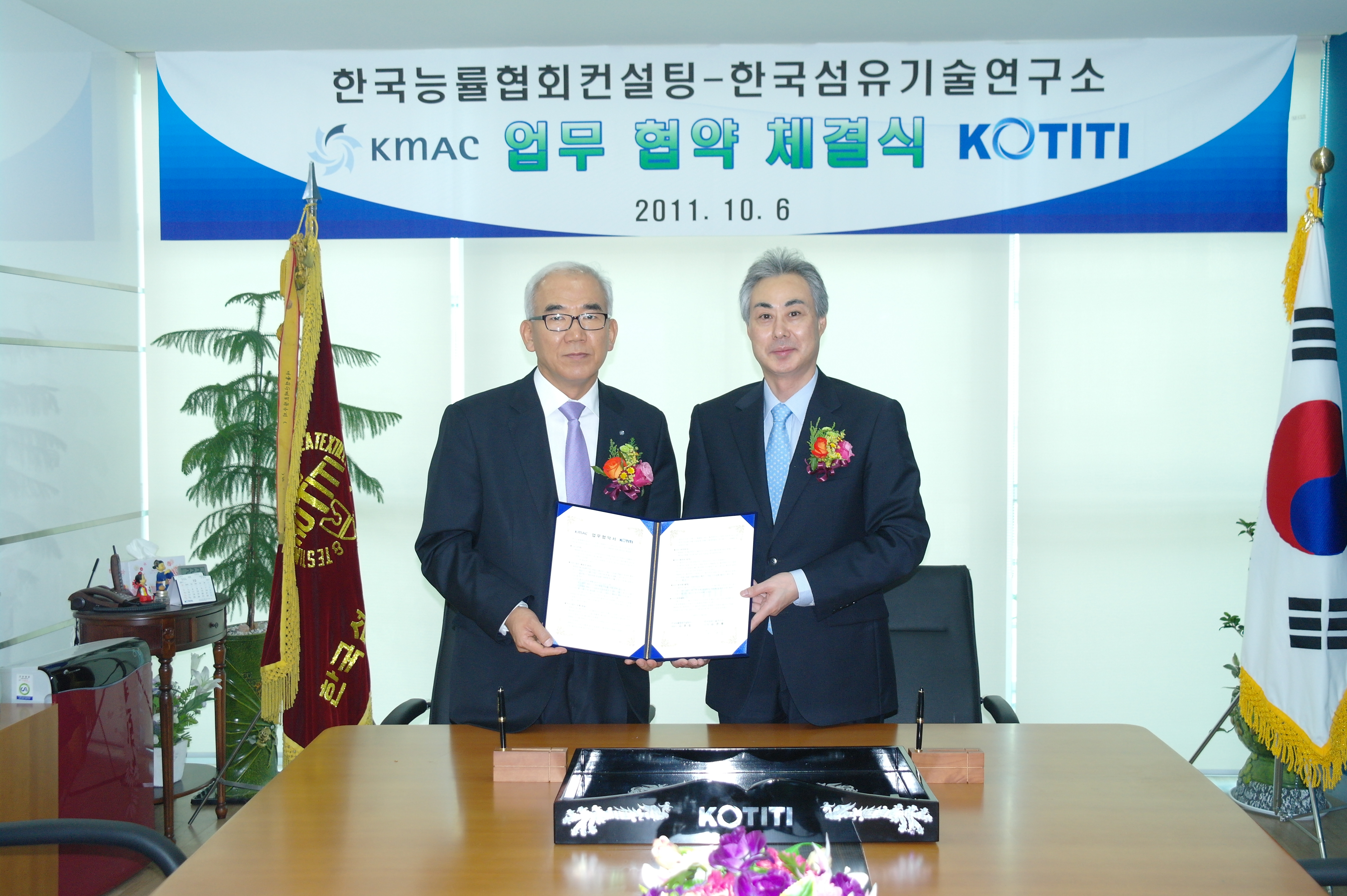 지난 10월 6일한국섬유기술연구소(KOTITI)는 지속 가능한 녹생 성장의 지원과 새로운 공동 비즈니스 모델을 발굴하기 위하여 기업을 대상으로 경영컨설팅 서비스를 제공하는 컨설팅 전문 기업인 한국능률협회컨설팅과 업무협약을 맺었습니다.