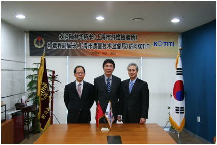 지난 10월 31일, 상해시섬유검험소(上海市纤维检验所,이하 SIFI)의 소장 루린화(陆林华)를 포함한 임직원 5명과 상해시질량기술감독국(上海市质量技术监督局)부국장 장쳥(章程)이 본 한국섬유기술연구소를(KOTITI, 이하 본 연구소)를 방문했다.