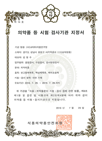 지난 2013년 식품의약품안전처로부터 화장품 시험·검사기관으로 지정된 이래 꾸준히 화장품 고객들에게 품질관리 및 시험분석에 대한 서비스를 지원하였고, 2016년 7월 의약외품에 대한 시험검사기관을 지정 받아 보다 폭 넓은 분야에 대한 시험·검사 서비스를 제공하게 됐다.