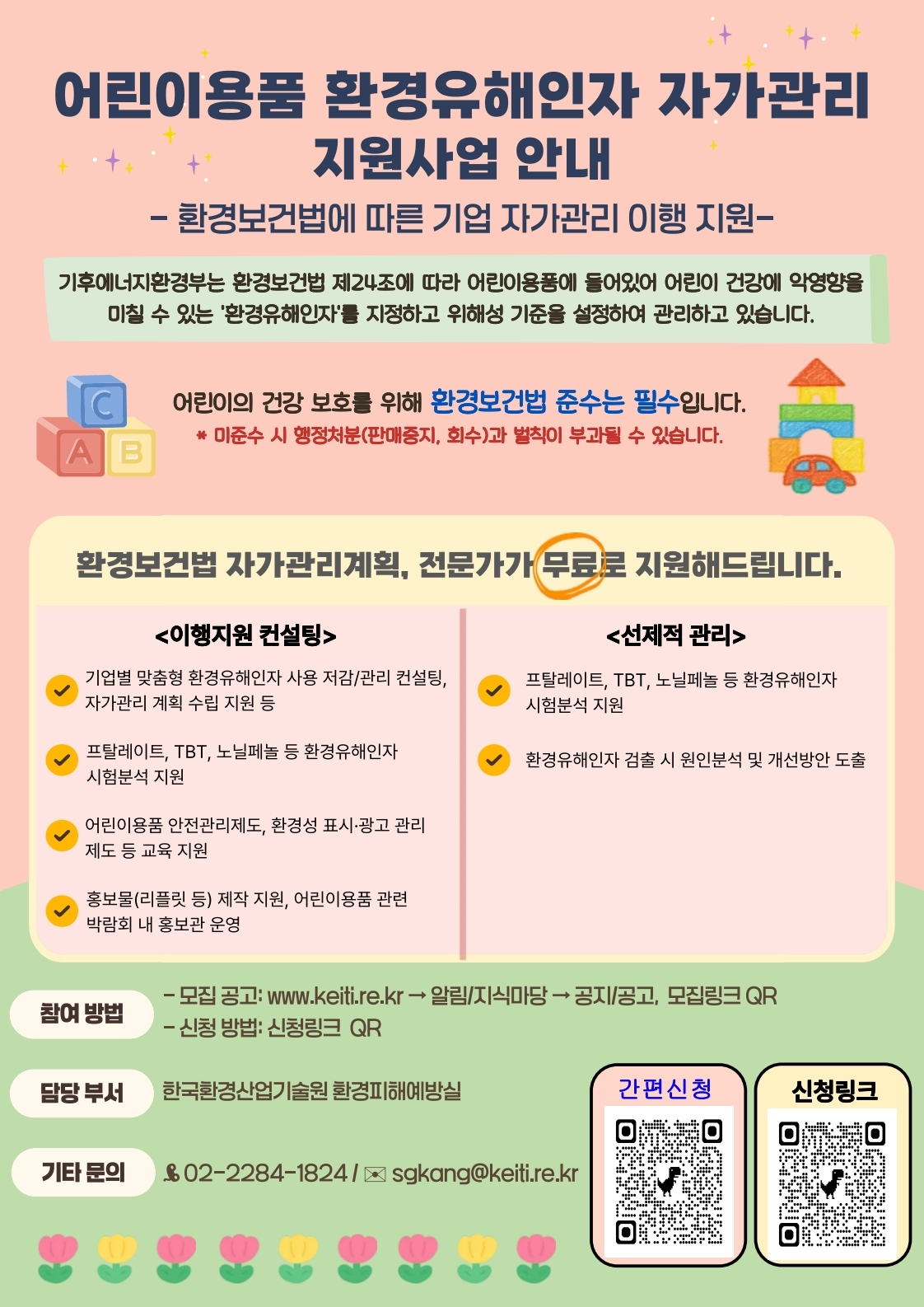 (모집대상·분야) 어린이용품(문구, 완구, 가구 등)을 제조·수입하는 중소기업 90개사 (자가관리: 40개사, 시험분석: 50개사)