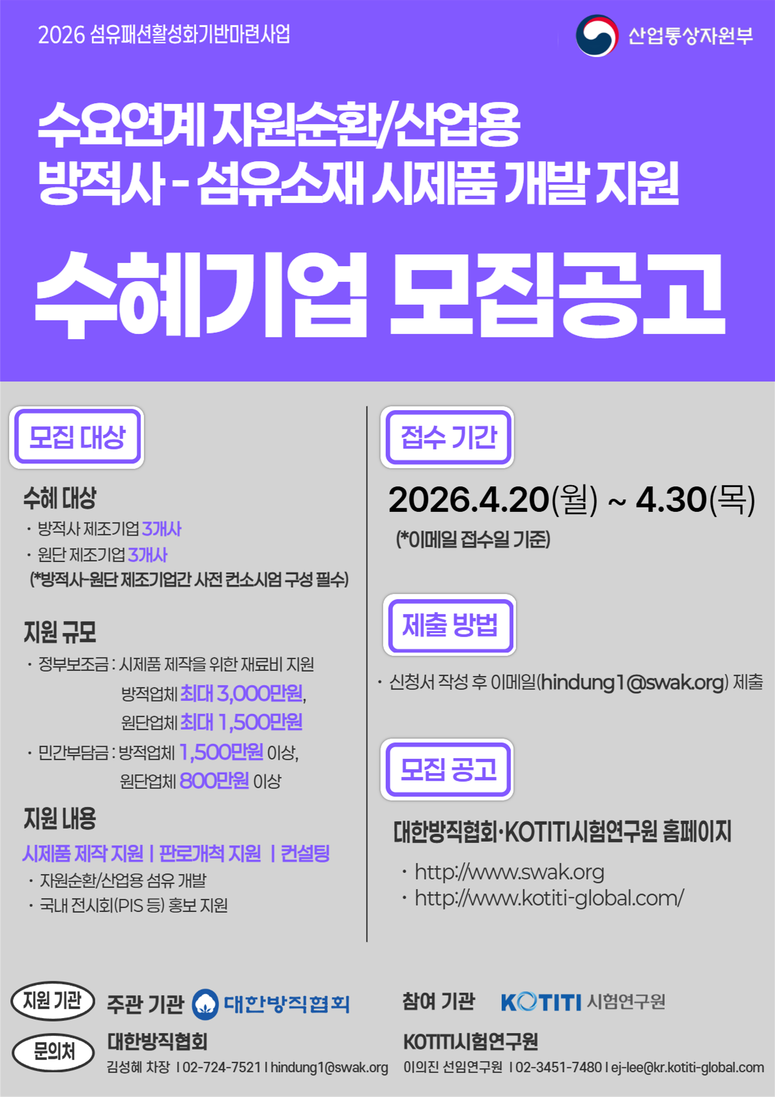 대한방직협회와 KOTITI시험연구원은 2026년도 산업통상자원부 「섬유패션산업활성화기반마련사업」의 일환으로 국내 방적산업의 제조경쟁력 제고 및 자원순환형 친환경 섬유 소재 개발을 위해 다음과 같이 「수요연계 자원순환/산업용 섬유 방적사-섬유소재 시제품 개발 지원」의 수혜기업을 모집하오니, 동 사업에 참여하고자 하는 기업은 아래 내용을 참고하여 신청하여 주시기 바랍니다.